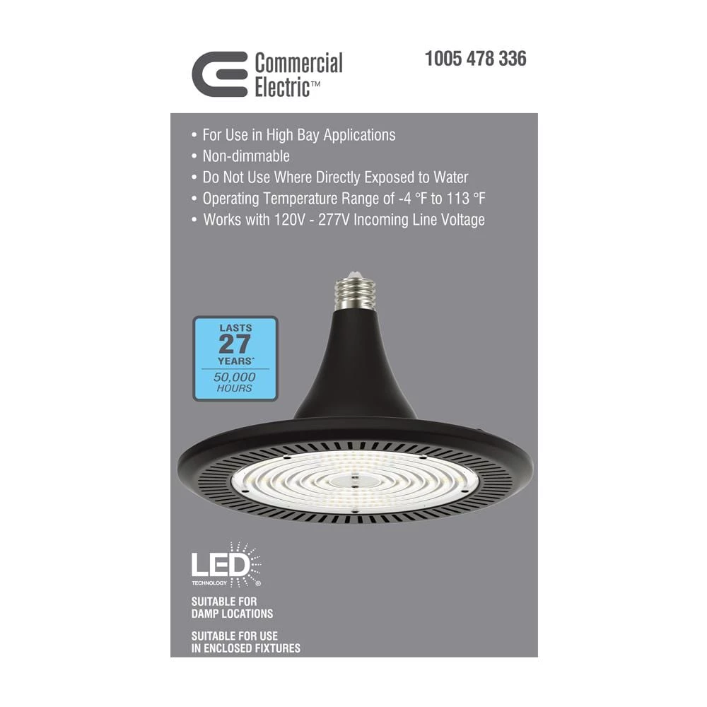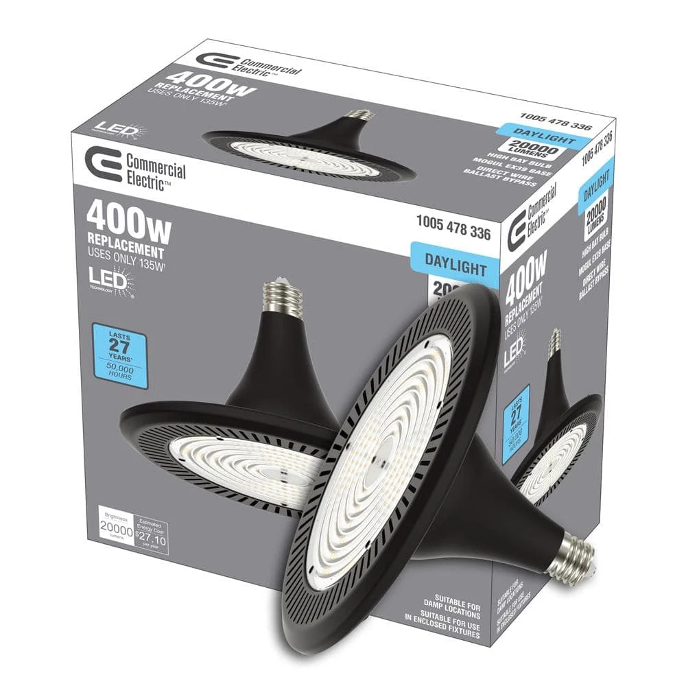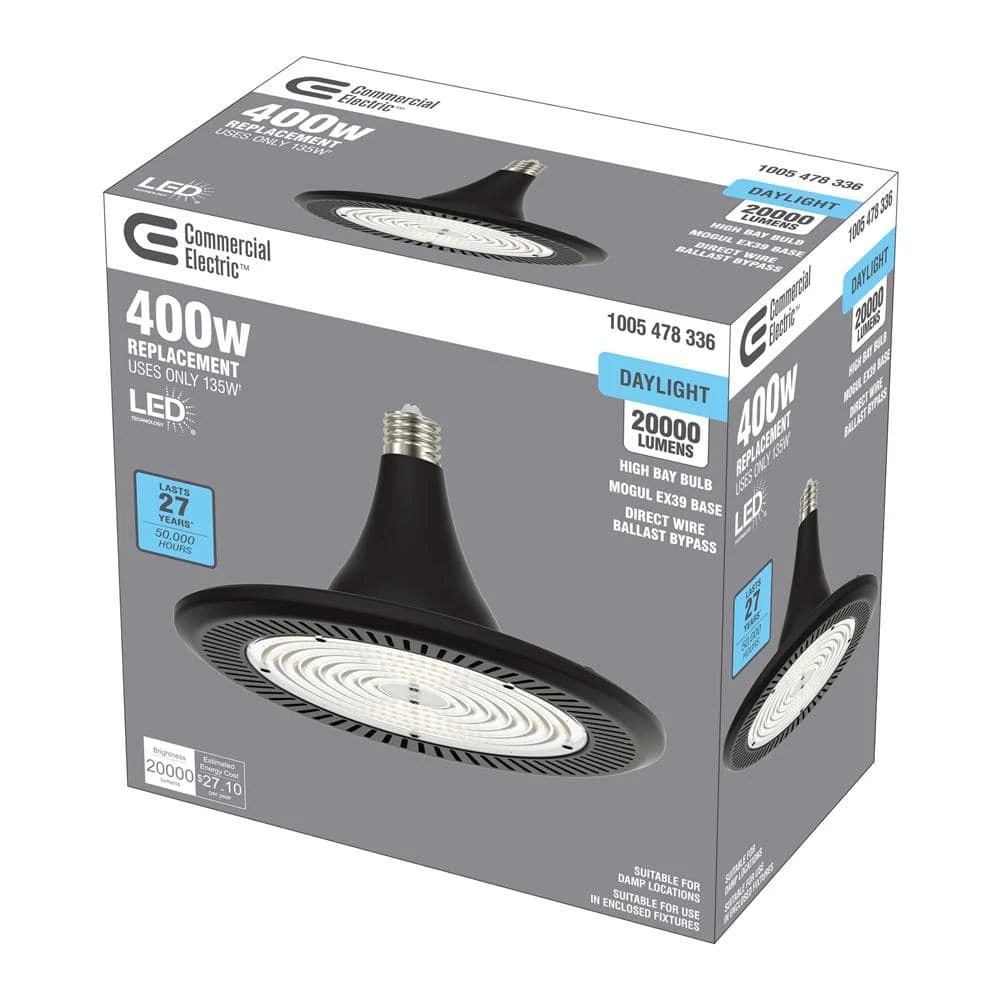 This high power LED bulb minimizes energy consumption by using only 135-Watt of energy to produce 20,000 Lumens of brightness. Developed for use in High bay applications. These high bay light bulbs are the low cost way to retrofit existing fixtures to energy efficient LED lighting technology. Perfect for commercial, industrial and residential applications, these bulbs will save on the cost associated with replacing CFL, incandescent, HID and halogen bulbs in hard to reach fixtures. Each lamp is the perfect high lumen LED refrofit for high bay or low bay fixtures requiring a mogul (EX39 base). This high lumen LED retrofit lamp is equipped with multi-voltage and can be used in 120-Volt to 277-Volt applications. 2000 Lumens of evenly distributed light at 5000K (Daylight) color temperature is reccomended for any area requiring bright and wide lighting. Use in Low/High bay application at warehouses, workshops, garage lighting applications and more. To install on ballast supported fixtures, the ballast must be bypassed. Rated to last for 50,000-hours of use. Suitable for use in totally enclosed fixtures or damp areas. Do not use where exposed directly to water.