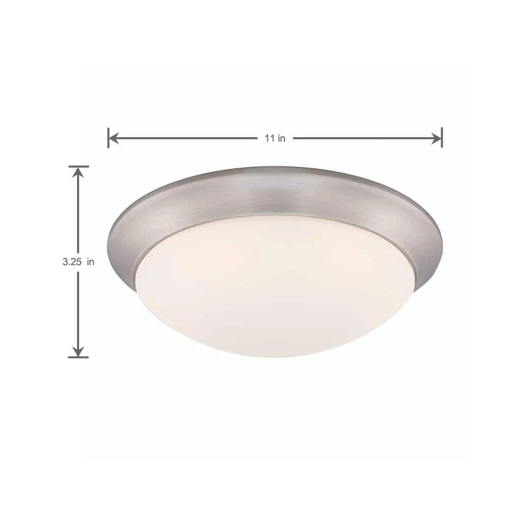 The Commercial Electric Brushed Nickel Finish 11 in. LED Flushmount with frosted white glass is designed to look great in any room while save you money at the same time. This dimmable, 12 in. round ceiling mounted light features a brushed nickel finish and sleek white glass diffuser. The integrated LED light source reduces energy consumption by 70 percent. Because there are no bulbs to replace, it saves you time and money.