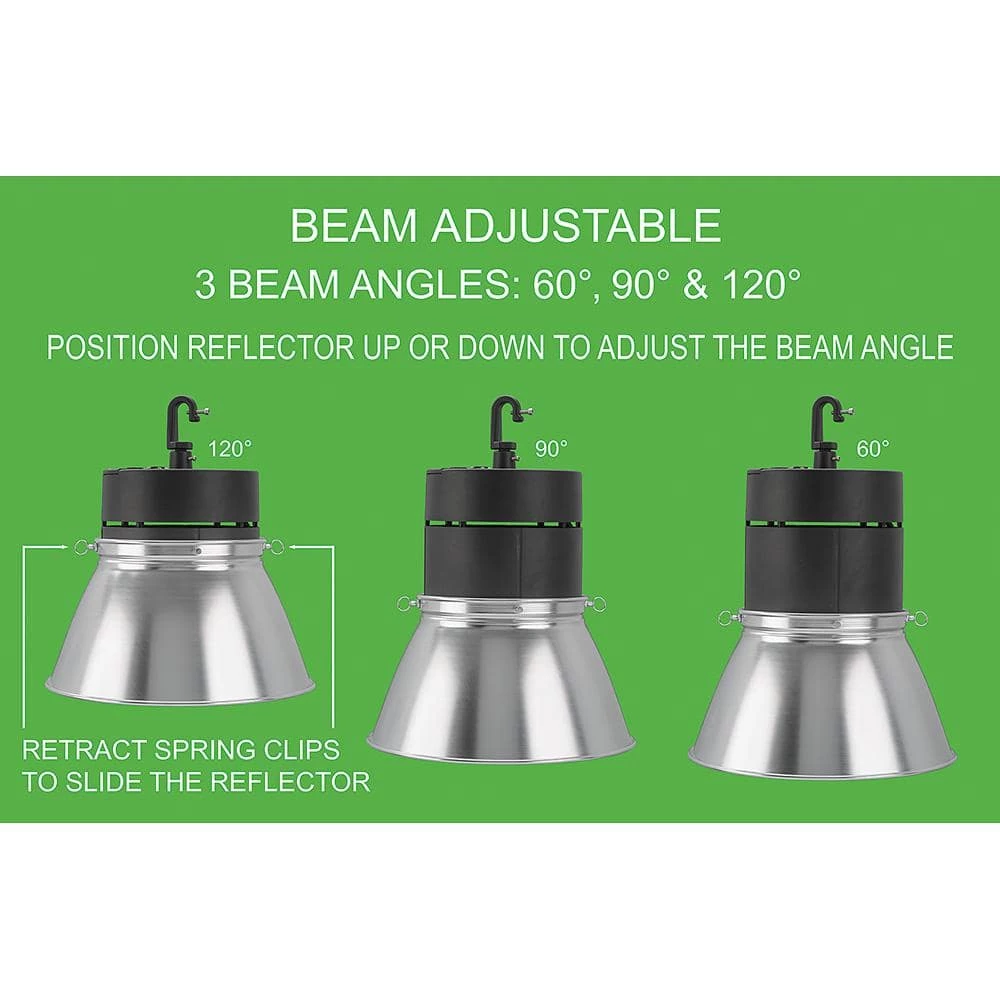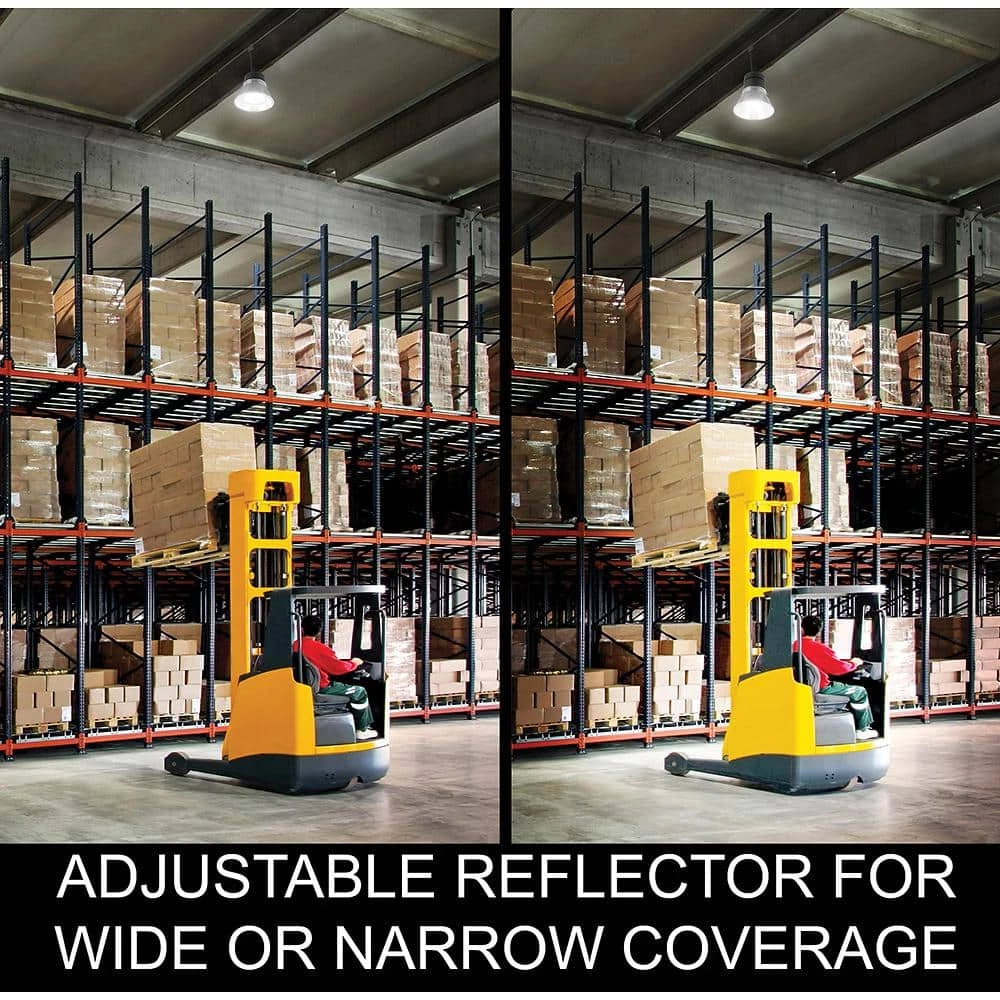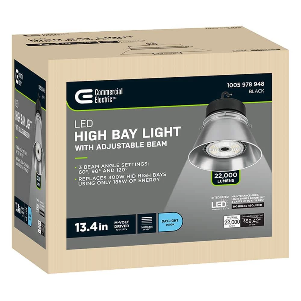 Commercial Electric’s 13.4 in. LED Adjustable Beam High Bay Light is the most unique high bay in the market. This innovative design has a leveraged function to customize the beam focus from narrow beam at 60° to wide beam at 120°. It emits powerful high output of 22,000 Lumens of brightness using only 185-Watt of electricity with 5000K Daylight color temperature for crystal clear illumination. It replaces outdated 400-Watt HID high bays. This is extremely beneficial for continuous low-energy consumption which in turn decreases the monthly utility bill for your business. This high bay is easy to install, long-lasting and maintenance free with no bulbs to replace.