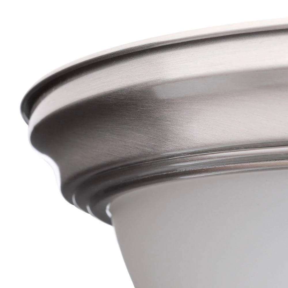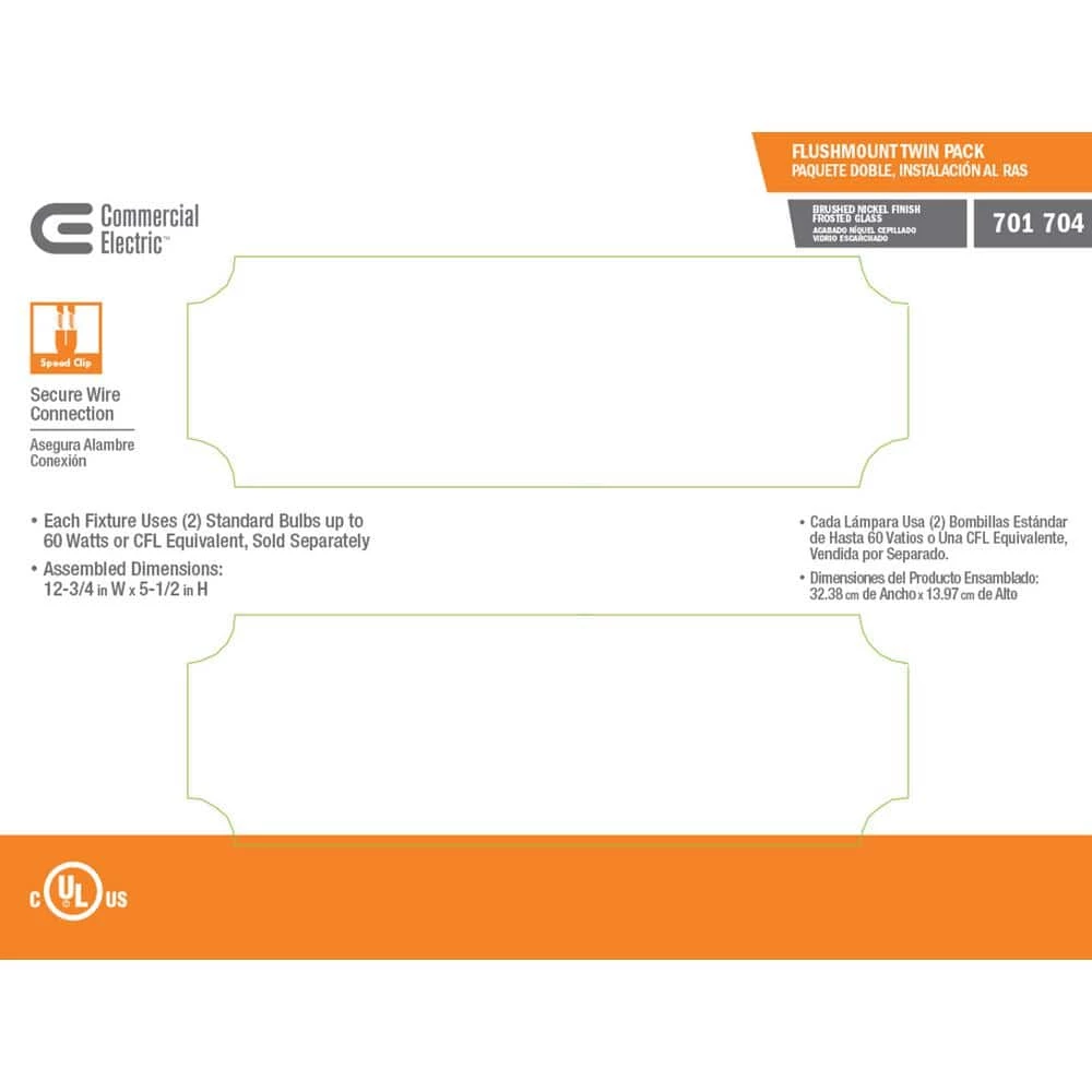 The Commercial Electric twin pack Flush Mount is a great look at a great value. From the professional to the do-it-yourselfer, the twin pack flushmount is an exceptional choice. Each Flush Mount is finished in Brushed Nickel with frosted white glass. Each Flush Mount uses two 60-Watt medium-base light bulbs. From kitchen to bath or any room in between, the CE Brushed Nickel twin pack will not only enhance but will save cost to your home as well.