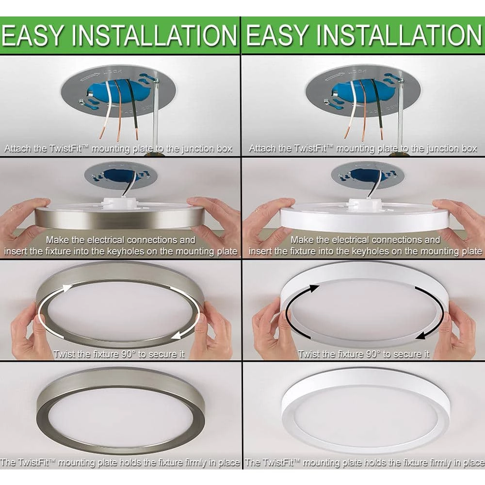 Commercial Electric Low Profile 13in. LED Flush Mount with 2 interchangeable trims is the perfect way to update your lighting by replacing outdated incandescent bulbs with energy-efficient LED technology. Prior to installation, switch out the White trim for the Brushed Nickel trim to add a little pop of color into your space. Additionally, choose between 3 color temperatures of light output: Soft White, Bright White or Daylight using the slide switch on the back of the fixture. Activate the Night Light feature which emits a Soft Amber glow around the fixture providing warm ambient lighting. Our innovative mounting system allows for quick installation into existing junction boxes using the TwistFit mounting bracket. (included) This flush mount is maintenance free with no bulbs required and lasts up to 50,000 hours. Great for kitchen, pantry, bedrooms, bathrooms, closets, stairways, hallways, basement, laundry room, craft room, playroom, den/office, retail store or boutique.