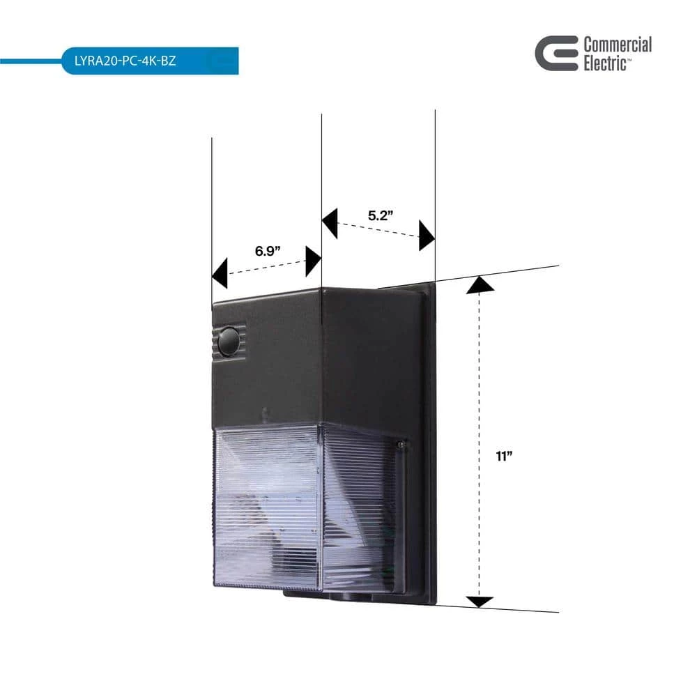 Add outdoor lighting you can rely on with Commercial Electric’s 2,500 lumens integrated LED wall security light. This 20-watt fixture can be installed virtually anywhere thanks to multiple conduit entries. The photocell turns the light on at dusk and off at dawn. The durable polycarbonate lens reduces glare and the aluminum housing protects against corrosion for up to 50,000 hours. The LED light uses 80% less energy than standard bulbs.