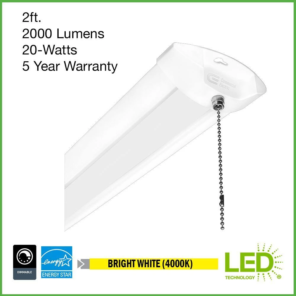 Commercial Electric 2 ft. LED Strip Light with Pull Chain is designed to replace any outdated fluorescent light with a crystal clear and energy-efficient integrated LED fixture. Ease This reduces energy consumption by as much as 79% compared to conventional lighting units and replaces 100-Watt bulb. Use the 20 in. on/off pull chain for easy activation. This fixture is maintenance free with no bulbs to replace for up to 50,000-hours. Ideal for closet, utility room, laundry room, stairway, hallway, basement, storage room, work bench or garage.