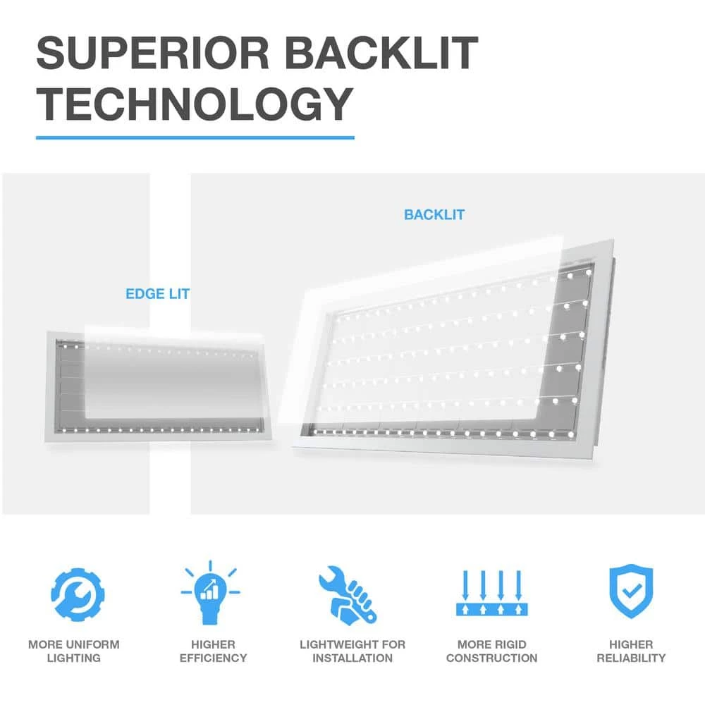 This energy-efficient 2 ft. x 4 ft. Backlit LED panel troffer is ideal for any location, emitting 6375 lumens of 4000K bright white light using only 50 watts. This fixture features an emergency driver that provides 90 minutes of illumination with 1530 lumens when AC power is removed. The PMMA anti-yellowing lens ensures a no-glare, even distribution of light at 120° that can be dimmed according to your needs. Installation is easy – simply secure the lightweight panel in a recessed T-bar grid ceiling using integral earthquake clips. The fixture qualifies for energy rebates and will reduce your utility bills for 50,000 hours of operation, well beyond Commercial Electric’s 5-year warranty.