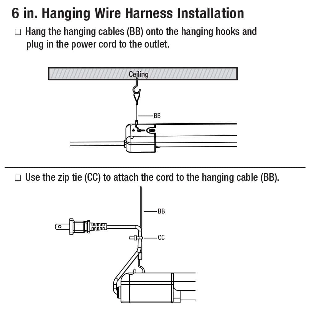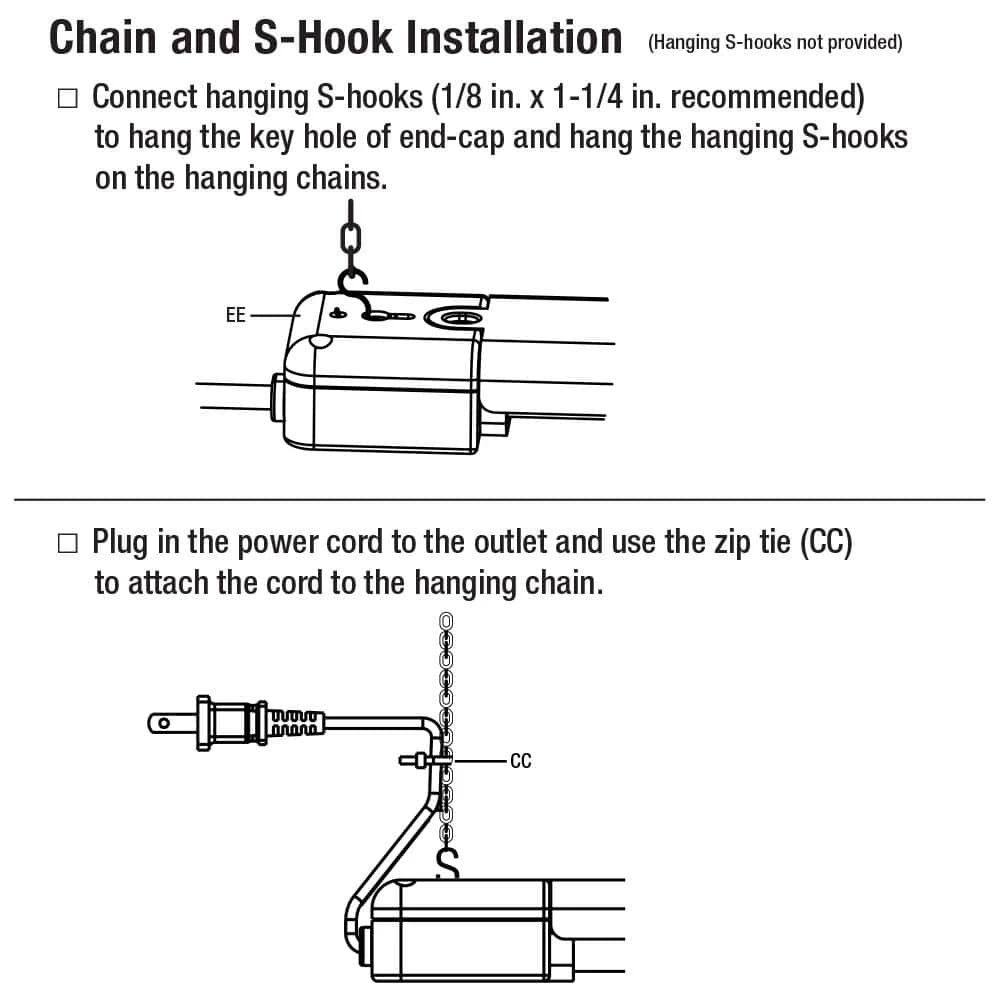 - Parts include (1) 3 ft. fixture, (2) mounting screws, (2) 6 in. hanging cables and (1) 5 ft. plug-in cord