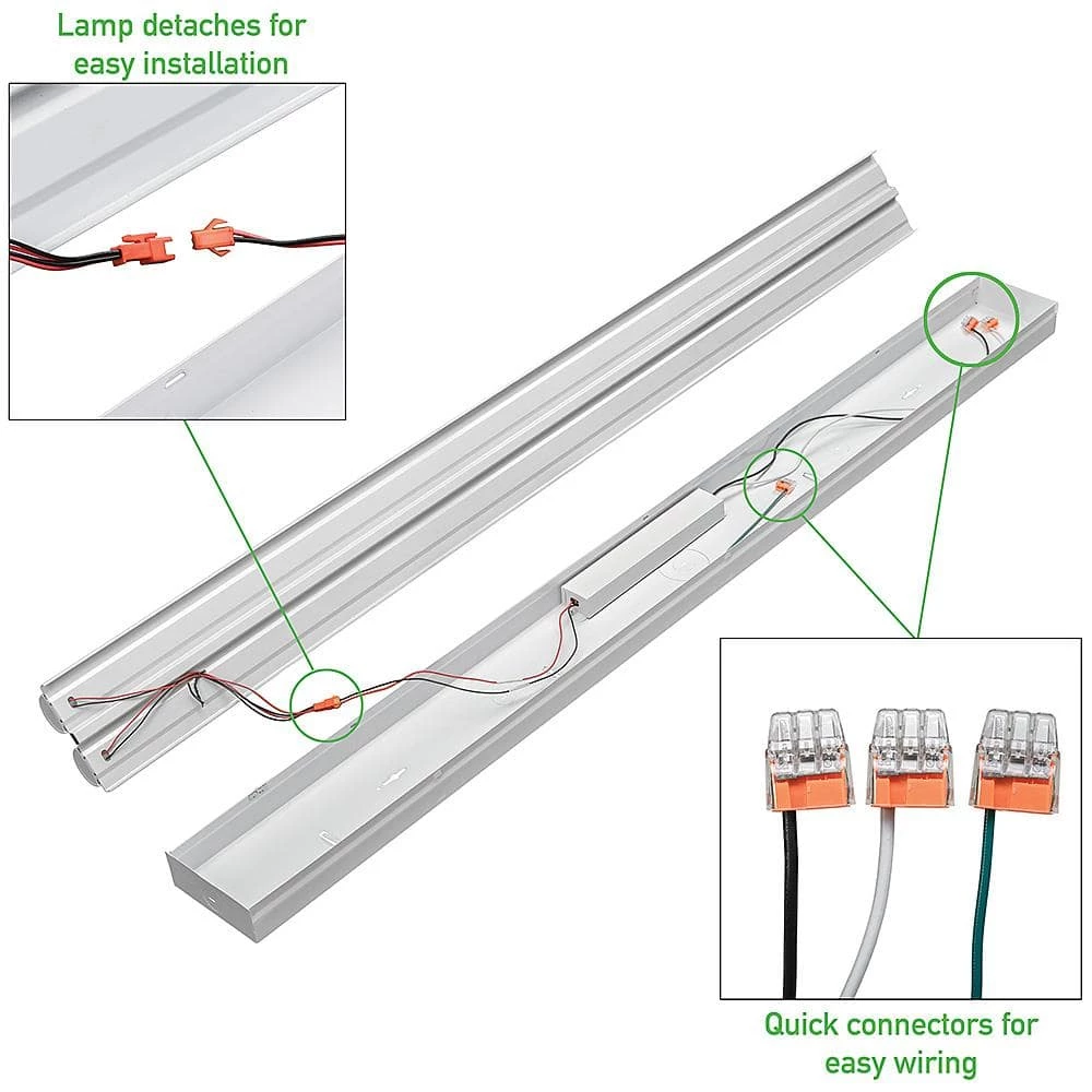 Commercial Electric’s 4 ft. Integrated LED High Output Wide Chassis Strip Light replaces outdated, buzzing and glaring fluorescent lights with cool energy-efficient LED fixtures. It has 2 LED lights built within a wide chassis constructed of durable, impact resistant material, no yellowing over time. It emits powerful 4500 Lumens of brightness of premium LEDs with 4000K Bright White light output. Replaces two 32-Watt fluorescent lights with 45-Watt of energy. It is lightweight, easy to install and maintenance free with no bulbs to replace. Ideal for garage, basement, repair shop, storage facility, warehouse aisles, retail, showrooms or small loading docks.