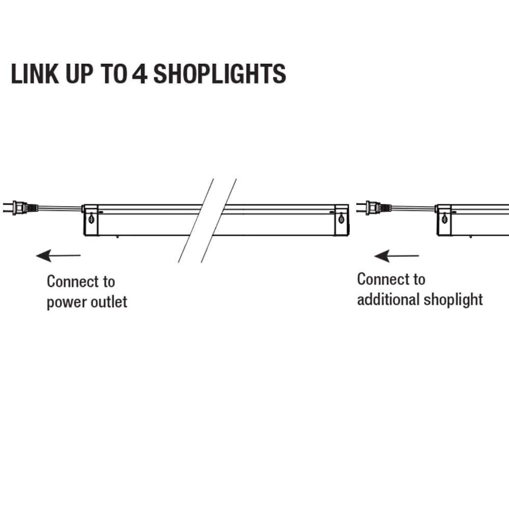 Commercial Electrics 4 ft.4-light Plug-in Integrated LED Heavy-Duty Utility non-dimmable shop light, uses 80-Watt and comes fully assembled with an ultra-light weight design that can be used in hanging or flush mount installation. This LED Shop Light lasts up to 50,000 hours and emits a bright light of 7000 Lumen which is equivalent to a standard four lamp fluorescent fixture. This no-humming LED Shop Light offers a cool white-light and adds instant full brightness to any dark lit area, even in sub-zero temperatures. There are no lamps to dispose of or replace with this 4 ft. four lamp LED shop light, making it ideal for garages, workshops or warehouses. includes two V-hooks, wall anchors and screw hooks with hanging chains, a convenient ON/OFF pull chain with 36 in extension chain with bell, a 5 ft. plug-in chord for power or link ability on one end and an outlet receptacle on the opposite end to allow up to 4 units to be linked together.