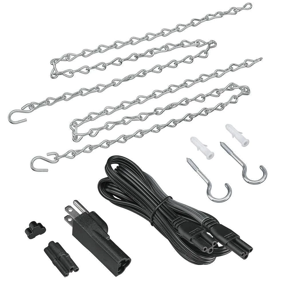 - Included: Electrical Plug Adapter, End-to-End Connector, End Cap, 5 ft. Power Cord/Linking Cable, (2) Mounting Chain with S Hook, Cable Tie, (2) Drywall Anchor and (2) Hook Screw
