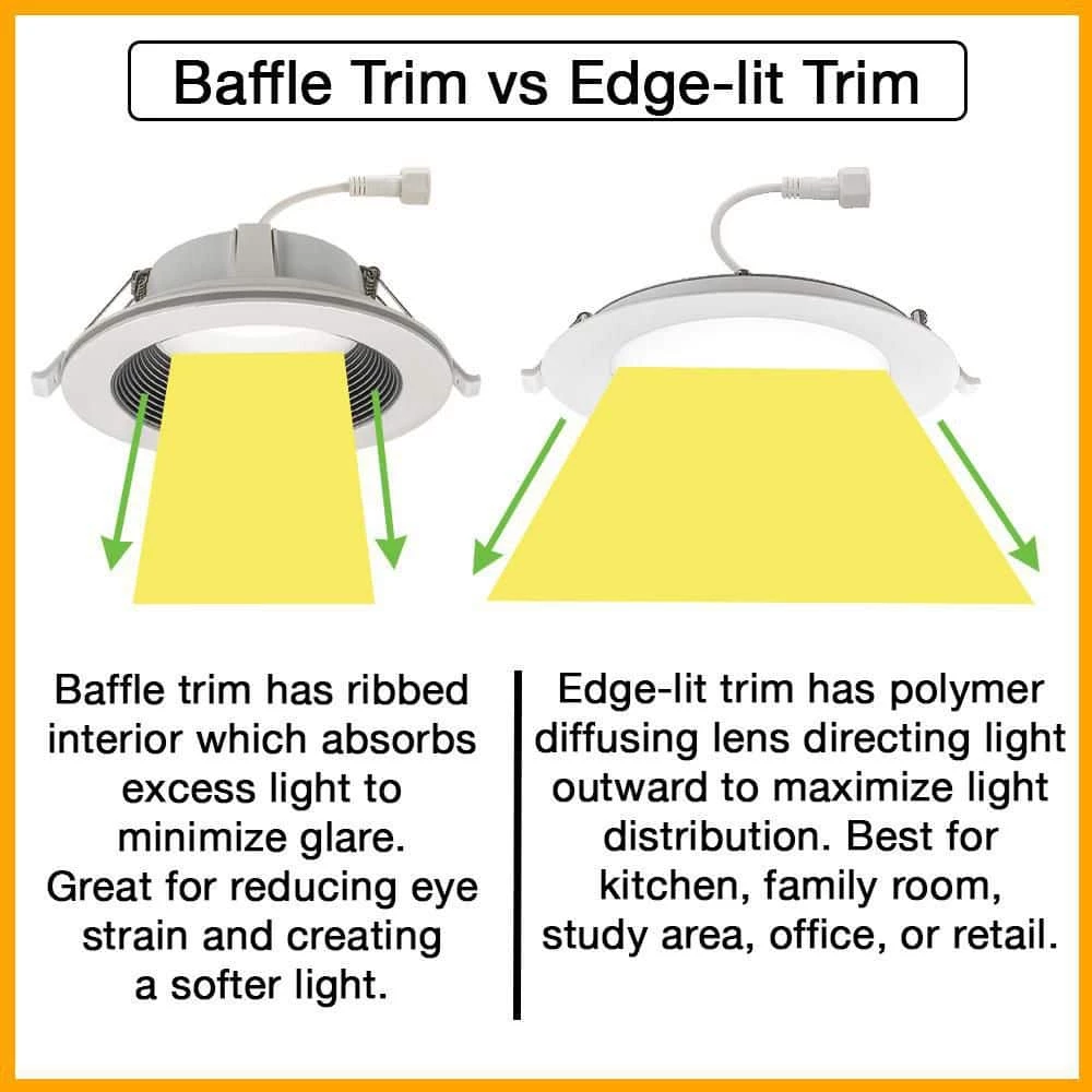 - Deep baffle trims absorb light to reduce glare and eye strain
