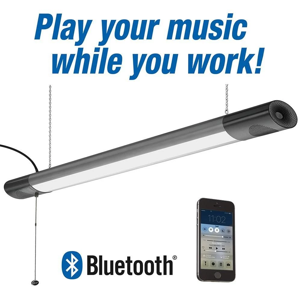 Commercial Electric 42in. Plug-in LED Shop Light with Bluetooth Speakers is designed to wirelessly connect to your smartphone to play your music or podcasts and still continues to provide crystal clear light output. You can activate audio from up to 33ft. and the speakers do not require any batteries or charging. Enable Bluetooth on your smart device using Commercial Electric’s app. To turn on just the light, there is a pull-chain for an easy grab. It is lightweight, easy to install and maintenance free with no bulbs to replace. Ideal for work shop, garage, basement, shed, small warehouse or entertainment room.