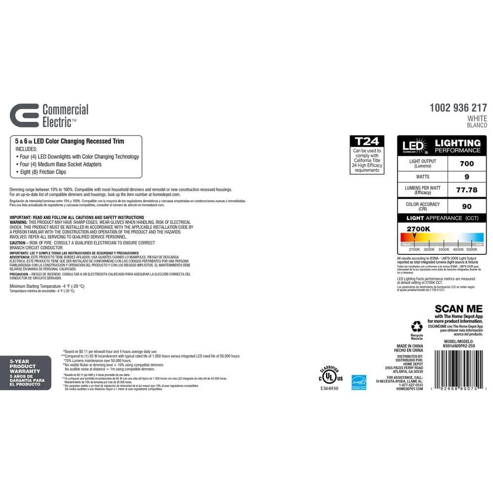 The Commercial Electric 5/6 in. Color temperature select LED downlight is an easy way to upgrade your existing can lights to the sleek look of recessed lighting and LED energy efficient technology. These LED downlights are compatible with most dimmer switches and are equipped with a unique color temperature (CCT) changing technology. Now you can select your color temperature depending on your needs or preferences with the flip of a switch located on the back of the downlight. Test different color temperatures before installation and never be dissatisfied with CCT again. Color temperature of these LED downlights ranges from Warm White (2700K) to-daylight (5000K), with 3 options in between: Soft White (3000K), Neutral White (3500K) and Bright White (4000K). Using only 9-Watt of energy but produce brightness comparable to a 65-Watt incandescent bulb, these LED downlight bulbs are estimated to cost only $1.44 per-year to operate. Additionally, these LED downlights are rated to last for 50,000-hours or approximately 34-years. That is 50 times longer than a traditional incandescent BR30 lightbulb, which these downlights are used most commonly to replace. Compatible with most 5 in. and 6 in. recessed housings and equipped with a medium (E26) socket base adapter for easy installation.
