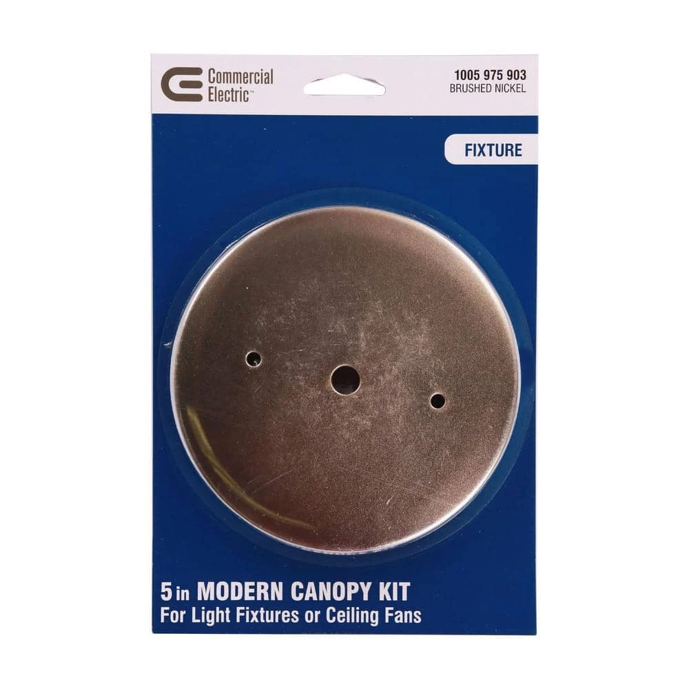 The 5 in. Brushed Nickel Finish Modern Canopy Kit for Ceiling Light Fixtures lets you suspend a light fixture anywhere in the home. Featuring a sleek and modern design, this simple Brushed Nickel finish canopy adds a blends in seamless with your existing decor while covering up an unsightly ceiling box. All pieces in the kit are mutually compatible, so you won’t have to worry about having a specific component on hand. Once you have installed the canopy, mount the lighting fixture following the manufacturer’s instructions. The kit contains a full collection of hardware for installation including: a crossbar, a screw collar loop, a locknut, mounting screws, a lock washer and cap nuts. The canopy is 5-1/8 in. Dia and has a 7/16 in. center hole. This kit is rated to support fixtures up to 50 lbs.