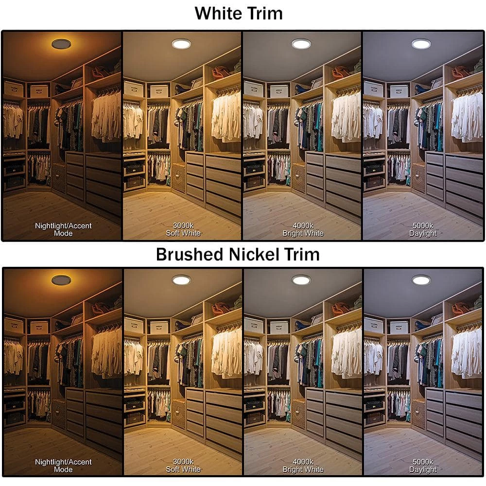 Commercial Electric Low Profile 9in. LED Flush Mount ceiling light with 2 interchangeable trims is the perfect way to update your lighting by replacing outdated incandescent bulbs with energy-efficient LED technology. Prior to installation, switch out the White trim for the Brushed Nickel trim to add a little pop of color into your space. Additionally, choose between 3 color temperatures of light output: Soft White, Bright White or Daylight using the slide switch on the back of the fixture. Activate the Night Light feature which emits a Soft Amber glow around the fixture providing warm ambient lighting. Our innovative mounting system allows for quick installation into existing junction boxes using the TwistFit mounting bracket. (included) This flush mount is maintenance free with no bulbs required and lasts up to 50,000 hours. Great for kitchen, pantry, bedrooms, bathrooms, closets, stairways, hallways, basement, laundry room, craft room, playroom, den/office, retail store or boutique.