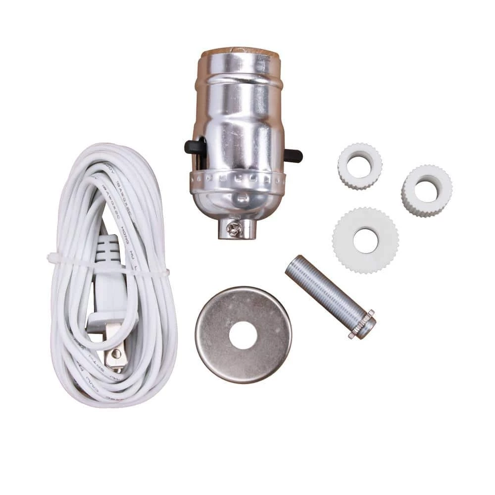 The DIY Bottle Lamp Kit with socket adapters specifically made for use with Bottles makes the process of creating and building your own lamp designs with all kinds of bottles simple and efficient. The 3 included rubber bottle adapters make it possible for you to turn a special vase or an attractive bottle into an original, working lamp base. A push-through socket attaches to correct size bottle adapter with the included nipple, check ring and lock nut hardware. Along with the socket, bottle adapters and included hardware, this DIY Bottle Lamp Kit also includes an extra long 8 ft., 18-Gauge cord set. Brushed Nickel Finish complements any lamp or space.