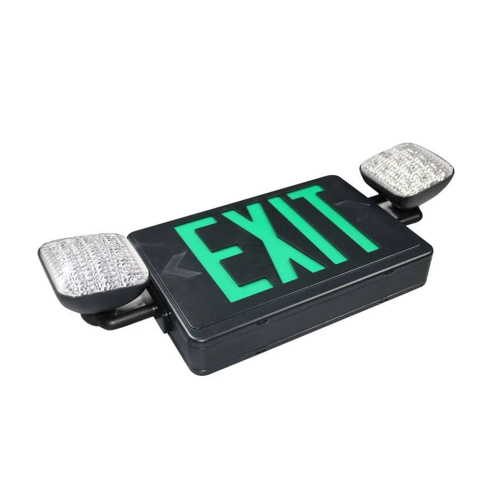 All LED Red / Green Exit Emergency Combo. The Commercial Electric Black All-LED Exit and Emergency Combination unit is perfect for applications requiring an Exit sign and emergency light in the same area. The High quality LEDs and battery backup make this unit virtually maintenance free. As an added feature this unit is equipped with both red and green stencils to accommodate local code requirements. It can be wall, top or end mounted.