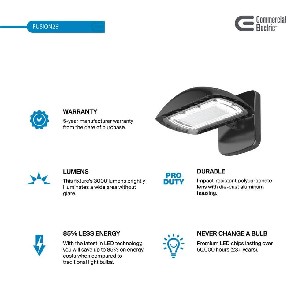 Add outdoor lighting you can rely on with Commercial Electric’s 3,000 lumens LED flood light. This security light shines a wide beam of bright white light across landscapes, building perimeters, driveways, loading bays, signage and more. The simple hands-free installation allows you to mount the light and swivel the beam as needed. The durable die-cast aluminum housing has a commercial-grade bronze powder coating to protect the fixture from corrosion for up to 50,000 hours. The LED light uses 85% less energy than standard bulbs.