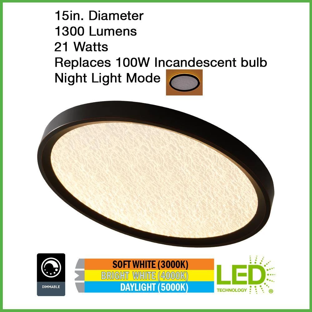 Commercial Electric’s 15 in. Low Profile Color Selectable LED Flush Mount with Night Light feature, acrylic crackle lens design in Oil Rubbed Bronze finish is the perfect way to add a bit of Modern flair to your home or office. It replaces outdated incandescent bulbs into a crystal clear energy-efficient integrated LED fixture. Prior to installation, choose between 3 color temperatures of light output: Soft White, Bright White or Daylight. Use the Night Light feature for added ambiance illuminating a warm soft Amber hue around the lens. It is lightweight, easy to install and maintenance free with no bulbs required. Ideal for kitchen, bedroom, bathroom, basement, office, stairwell, hallway/corridors, retail/boutiques and much more.