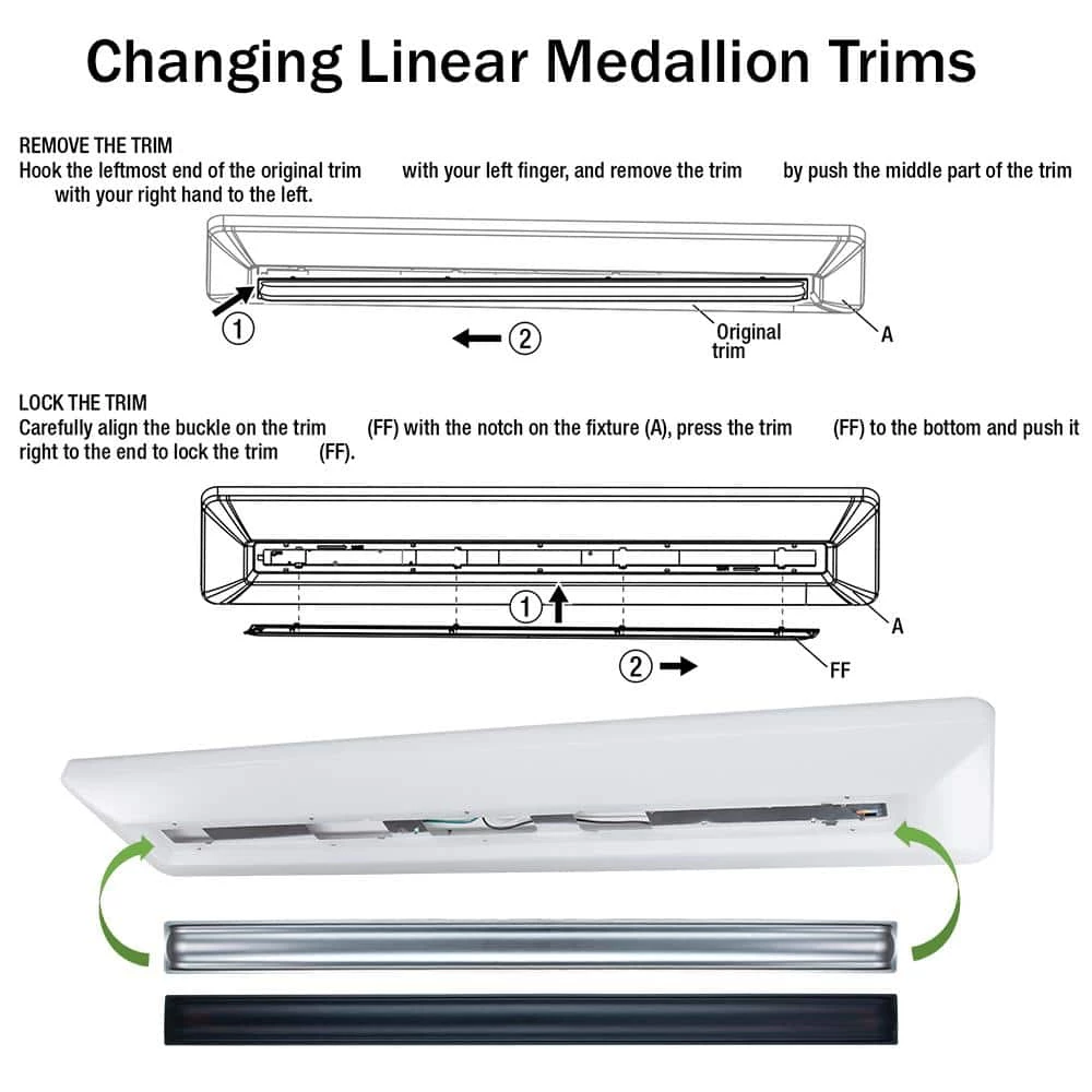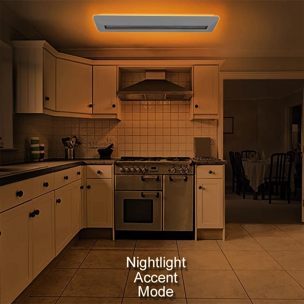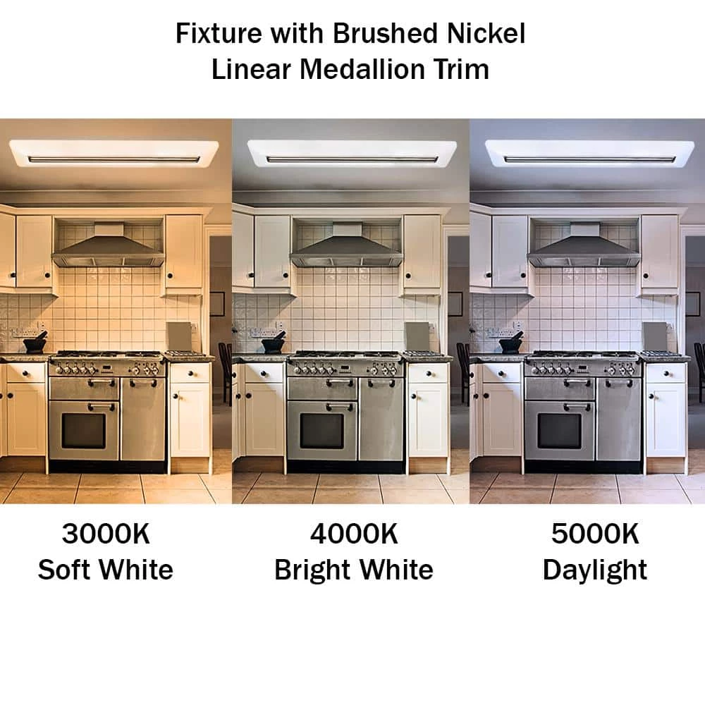 Commercial Electric’s Low Profile 4 ft. x 10 in. LED Flush Mount with Night Light Feature and 2 Decorative Linear Medallions is an innovative and Contemporary fixture designed for home or office. Choose between 2 decorative linear medallions in Brushed Nickel or Oil Rubbed Bronze to cover the center depending on your decor. Prior to installation, you choose between (3) color temperatures of light: Soft White, Bright White, Daylight. Our unique patented Night Light feature is for low ambient lighting when you do not want full illumination. Perfect to leave on for the evening, child’s room, hallway, stairway or basement. Activate it by toggling your wall switch On/Off/On. This flush mount emits 4000 Lumens of brightness using only 50-Watt of power. It is lightweight, easy to install and long-lasting to ensure maintenance free with no need to replace any bulbs. Ideal for kitchen, laundry room, bathroom, bedroom, hallway, stairway, basement, office, corridors, retail spaces and so much more.