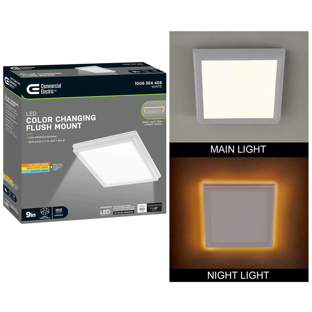 Commercial Electric 9in. LED Square Flush Mount with Night Light feature is the perfect combination of Contemporary design and innovative LED technology. Turn on the Night Light feature which glows a Soft Amber color around the fixture providing warm ambient lighting. Prior to installation, choose between 3 color temperatures of light output: Soft White, Bright White or Daylight depending on your location. Installation is a breeze using the TwistFit to Junction box mounting; just twist and lock firmly into place. Perfect for the DIY-er! This LED flush mount provides crystal-clear illumination and superior light engine for maintenance free service with absolutely no bulbs to replace. Great for bedrooms, bathrooms, living room, entry way, hallway, kitchen, basement, sun room, office, retail shops or lobby.