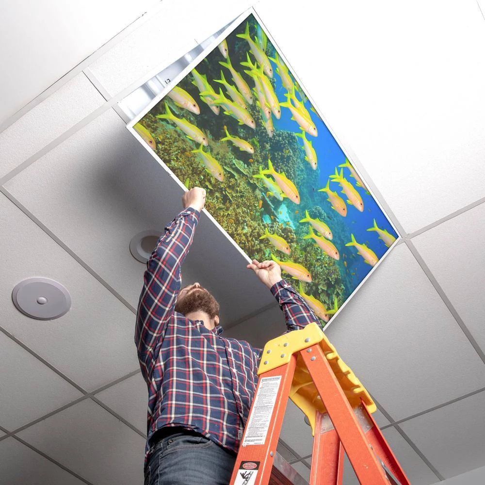 Octo Lights – Fluorescent Light Covers – Ocean Series: Reduce harsh fluorescent glares and escape the indoors without leaving your desk or cubicle. Whether at home, in school, or at the office, liven up any fluorescent lighting system with the Octo Lights’ ocean design light filters to make every day feel like you’re exploring the underwater depths! Made with top quality materials and featuring high-resolution photo prints the Octo Lights ocean light covers are designed to enhance any space you choose to install. By removing the harsh glares from the fluorescent lights, your living and workspace will be transformed into one of peaceful aquatic serenity. Octo Lights Features and Benefits: Lightweight and Flexible, Eco-Friendly, Self-Extinguishing Material, Easy Installation and Exchange, UL Certified, Safe for All Environments, Available in Backlit Film for Traditional Fluorescent Lighting Systems. Perfect For: Homes, Kitchens, Classrooms, Offices, Workshops, Hospitals, And More! About Octo Lights: As leaders of the lighting industry, we take pride in offering high quality ocean fluorescent light covers that are easy on the pocket. Our experts use high-resolution images to develop flawless nature-themed ceiling tiles. You can rest assured that you’ll be paying for top-notch light products in the market.