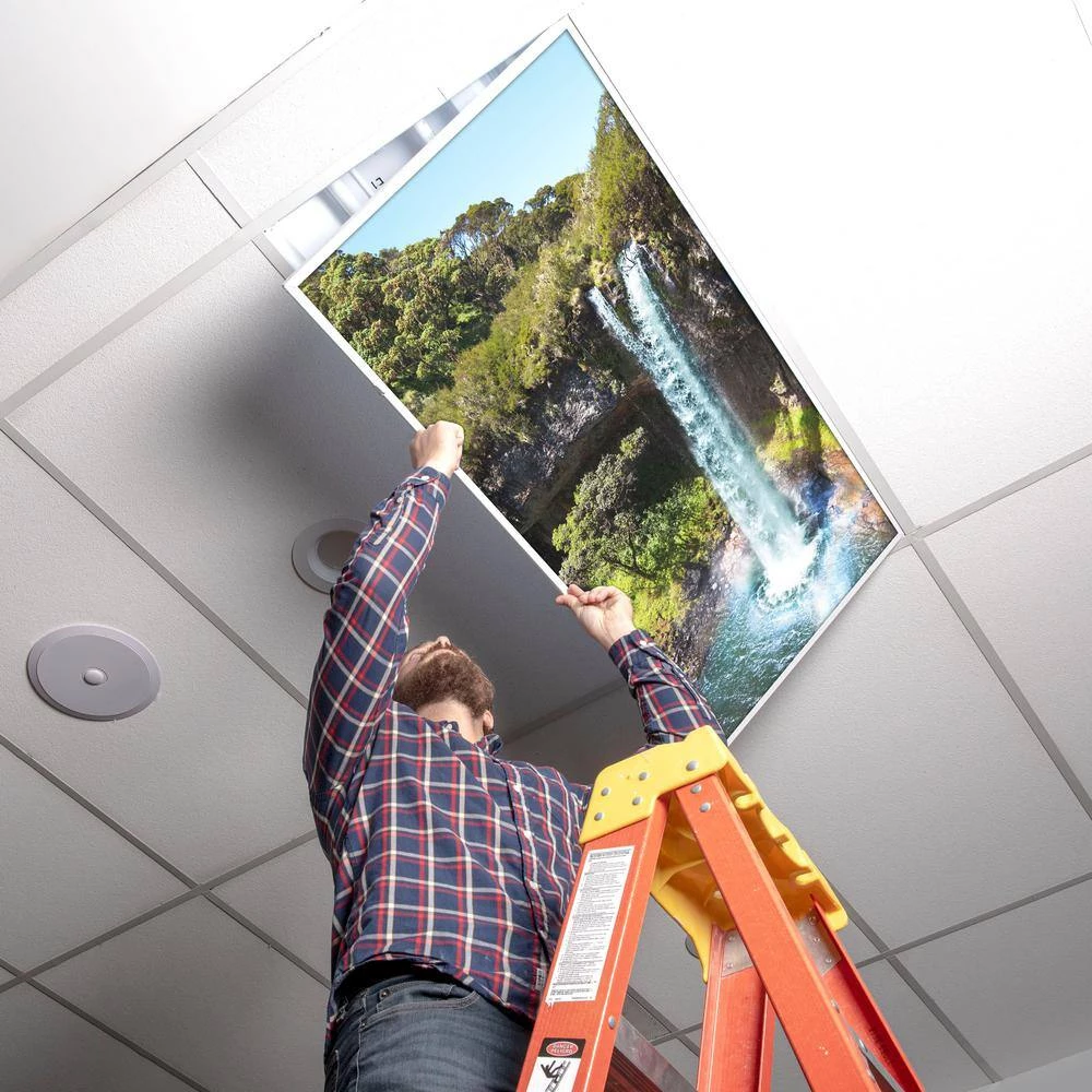 - ?UNIVERSAL 2×2 FIT? Octo Lights’ decorative waterfall light covers seamlessly fit any standard 2×2 fluorescent ceiling light. The actual size of each panel measures, 22.38″ x 22.38″